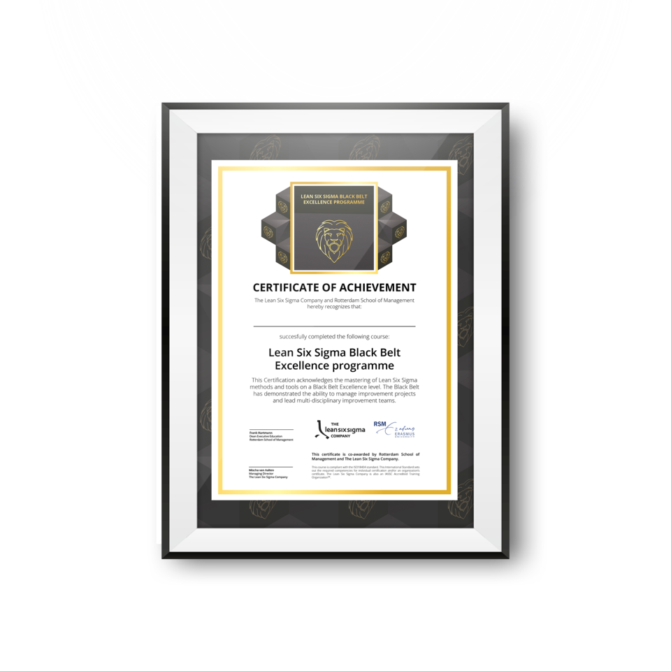 Black Belt at academic level In cooperation with Rotterdam School of Management, Erasmus University (RSM), we have organised the Black Belt Excellence Programme. This is the most complete Lean Six Sigma training programme thus far, supplemented with a change management module developed by RSM. The role of the Black Belt Excellence is to translate an organisation’s Operational Excellence strategy into clearly defined improvement initiatives together with the Master Black Belt(s). With a team of Green Belts and Lean specialists at their side, the Black Belt Excellence executes these improvement initiatives and in doing so improves efficiency and customer value. The added value of a Black Belt Excellence certificate The Black Belt Excellence programme is an exclusive course which enables participants to distinguish themselves on the international employment market. During the Black Belt Excellence programme you will be trained to execute trans-departmental improvement projects. At international organisations, projects will also often cover multiple countries, and you will have to cope with cultural differences. Thanks to the Change Management module developed by RSM (a top 10 Business University) and the Black Belt curriculum that is in accordance with the international ISO18404 standards, you can be certain of your ability to successfully execute your Lean Six Sigma projects. The academic Black Belt course for professionals Rotterdam School of Management, Erasmus University (RSM) is one of Europe’s top 10 business schools, helping students, academics and people in business become a force for positive change. Practical Information The curriculum consists of 14 days, of which 11 days will focus on Lean Six Sigma, and the other 3 days will be centred around change management and leadership; the two key-elements to being successful as a Black Belt. The programme is based on the international ISO 18404 standards and meets all set requirements to certify as a Black Belt. The course is partially provided by Rotterdam School of Management and partially by The Lean Six Sigma Company. The course is provided in English and contains 2 assessment moments. A written exam and a practical exam. Therefore completion of a practical assignment is mandatory. The Lean Six Sigma experts who will be providing the Excellence programme: RSM is ranked as one of the best European business schools, including 10th in the Financial Times meta-ranking and 3rd in Western Europe by Eduniversal. RSM has an acceptance rate of between 20–25% and is in the 1% of business schools worldwide which possess the distinguished Triple Crown Accreditation – AMBA, EQUIS and AACSB. Summary 14 day theory + practical assignment Lead time theory 3-4 months (see training dates) Lead time practical assignment 4-6 months Benefits practical assignment: > €75,000.- Passed when receiving a satisfactory grade for written exam and completion practical assignment Theoretical part by means of classroom training from 9.00 – 17.00 hrs Groups up to 20 people After completion of the training you will be capable of: managing a Lean Six Sigma improvement project managing an improvement team applying the Lean Six Sigma methodology and tools successfully implementing a defined solution within an organisation Part 1 - Lean Thinking 3 day training about the Lean techniques covering topics like: These days have been set up around a simulation which is a key element throughout the training. Part 2 - Six Sigma During 8 days the training will elaborate on the Six Sigma project structure and related techniques. The main topics that will be covered are: – Background Six Sigma Part 3 - Change management and Leadership Intensive focus will be on change managment and leadership during these 3 days. 2 necessary skills to be successful with Lean Six Sigma. These 3 days will be carried out by the Rotterdam School of Management of the Erasmus University. The main topics that will be covered are:: – What is change? Dr Barbara Banda is a specialist in leadership development, business strategy and organisational change, and is highly skilled and experienced in coaching senior leaders and board-level executives, as well as leading large- scale strategic projects for multinationals, governmentdepartments and non-profits. She is passionate abouther work having a direct and lasting impact on individuals and organisations. Her doctoral research focused on the importance of connecting management education to the workplace. She has designed and delivered blended leadership development coaching for global organisations, and is a former professor of practice (one who promotes the integration of academic scholarship with practical experience) at Hult/Ashridge Business School. In addition to consultancy, Barbara is a visiting faculty member at RSM, for Duke Corporate Education, and at TIAS School for Business and Society. She has a PhD in Management Learning from theUniversity of Oxford, an MA in Organisational Change, anMSc in Training and Performance Management, an MBA,and a BA in German and Russian. Barbara spent 13 years in senior roles in marketing and business development in the pharmaceutical and healthcare industry, and has experience in the automotive and recruitment services sectors. Part 4 - Practical Assignment A practical assignment is an improvement project often within your own organisation. The project has to visibly contribute to the aim of your organisation: generating money and/or improving customer satisfaction. Care institutions and governments more often aim to improve customer satisfaction and lowering the operational costs. In short: an improvement project must have a positive business case. Examples would be: Improving customer satisfaction, less customer complaints, improved quality of products or services and lowering the costs. These results have to be achieved by using Lean and Six Sigma techniques. Contact us for all your questions. All-in 
