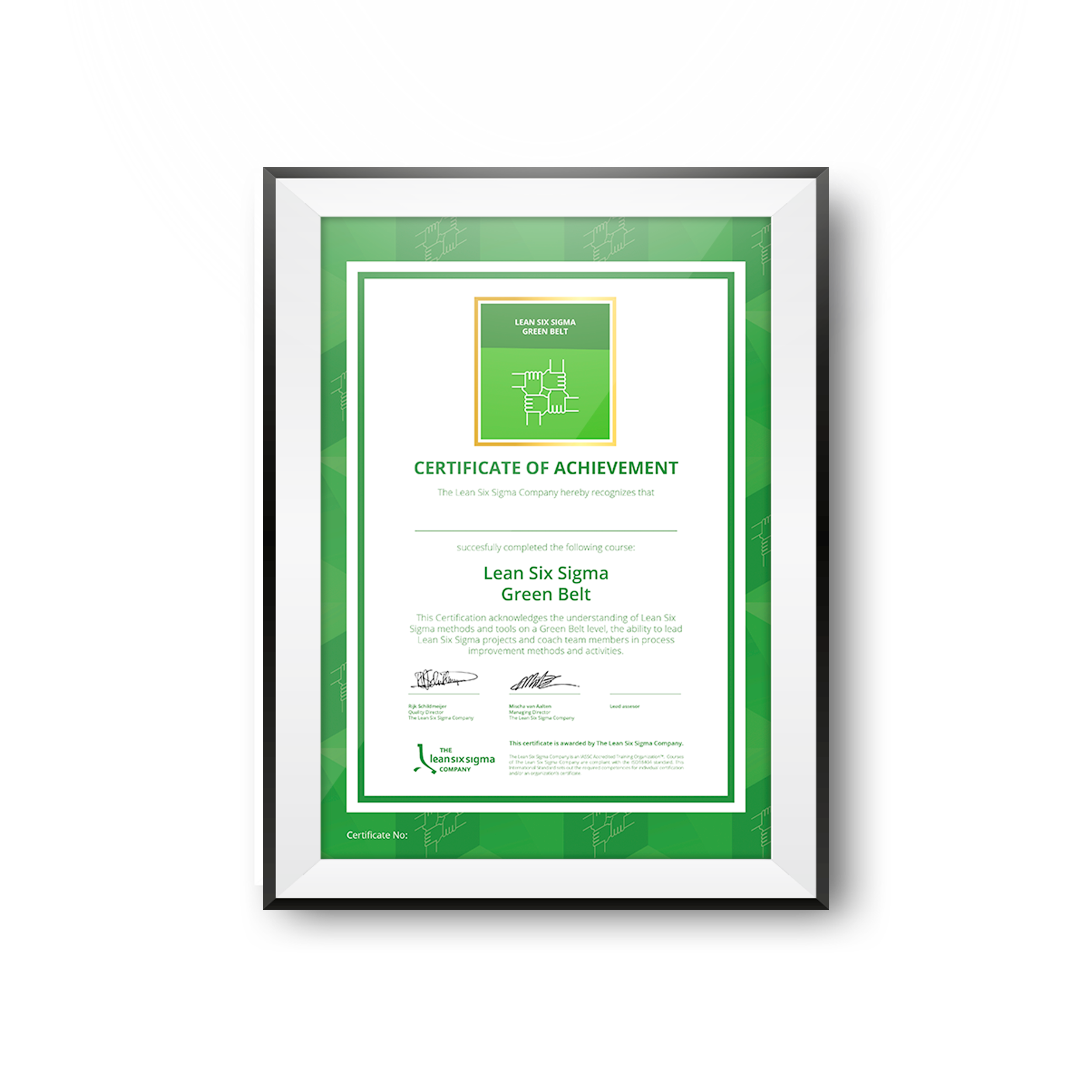Depois de concluir o exame com êxito, receberá o certificado de Lean Six Sigma Green Belt, reconhecido internacionalmente, referente à parte teórica. Após a conclusão do trabalho prático, receberá o certificado da parte prática e será um Green Belt certificado.